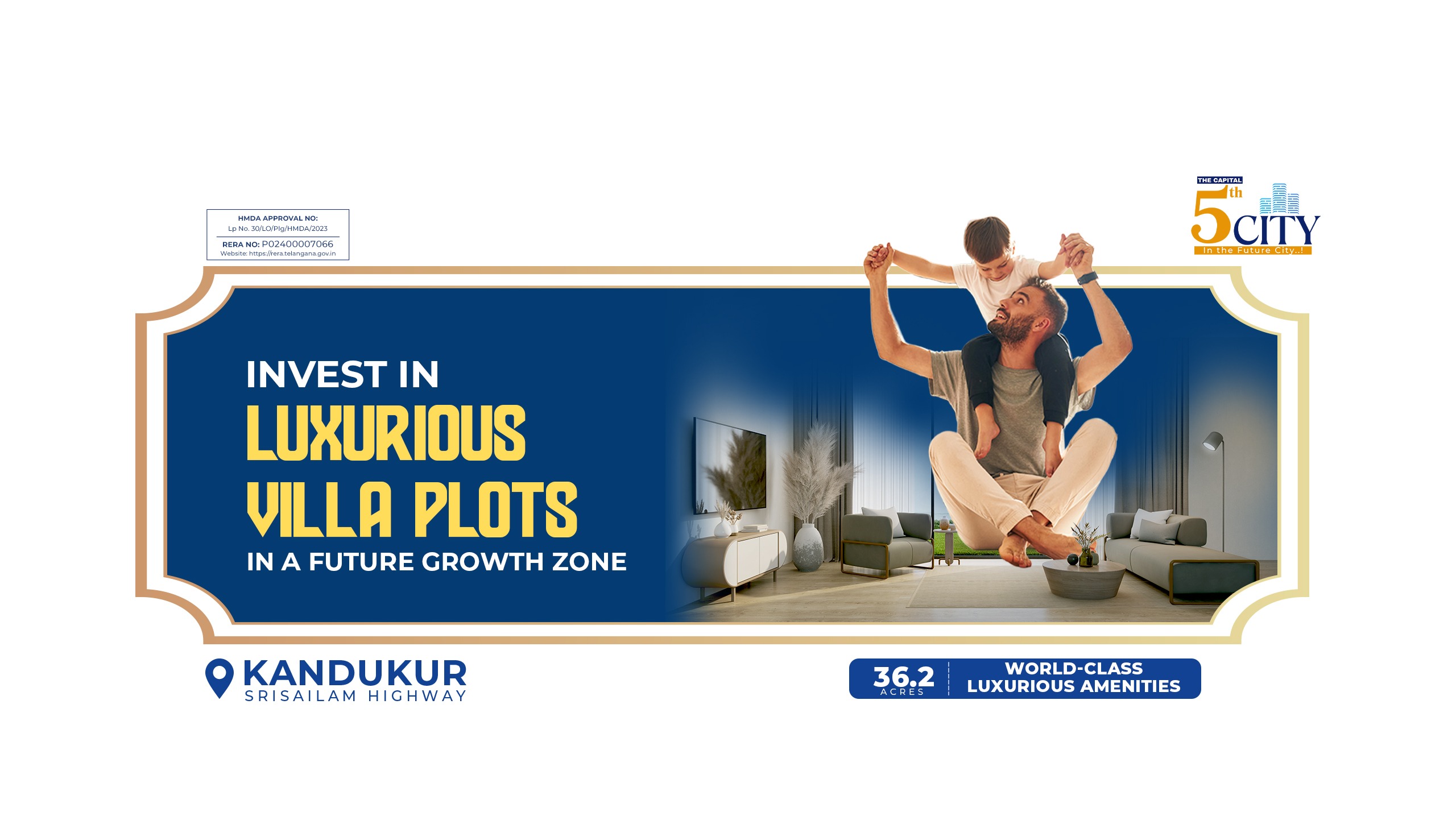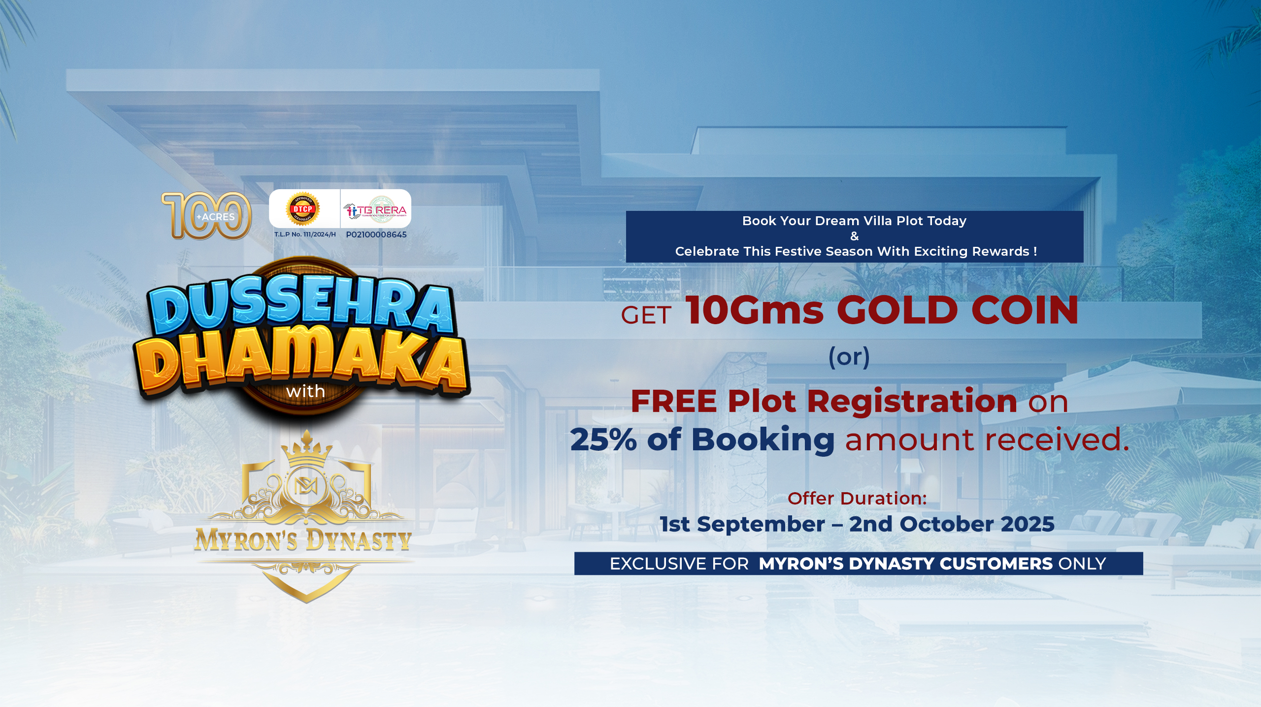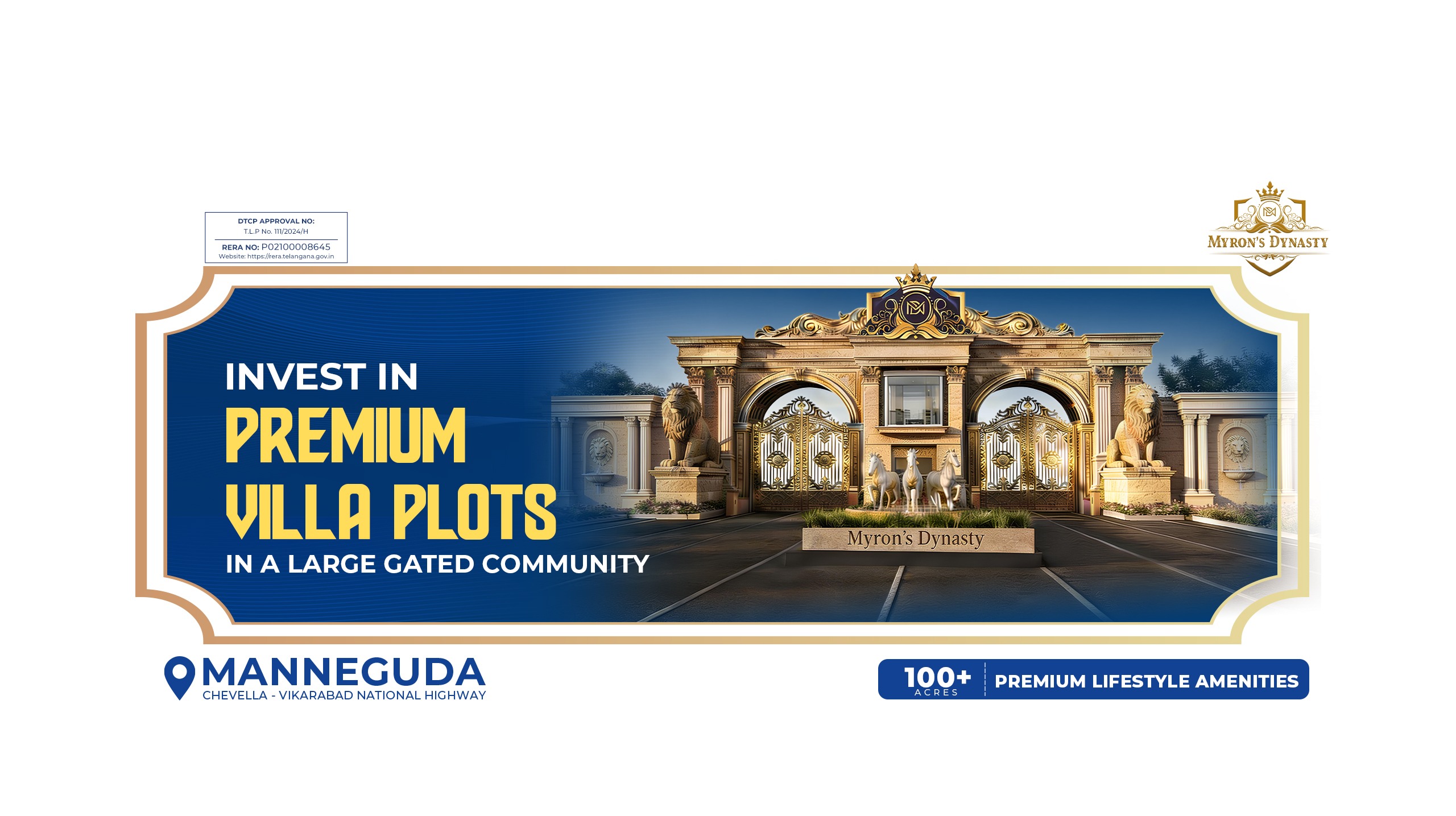 Myron’s 5th City is an HMDA and RERA-approved premium villa plot project located on a picturesque landscape of 32.6 acres. It offers 403 plots with clear titles that range in size from 150 to 433 square yards. The vaasthu-approved layout includes all the conveniences required for a comfortable and secure life. An exclusive clubhouse is tucked away among the meticulously maintained greens. It is completely furnished with modern recreational amenities.