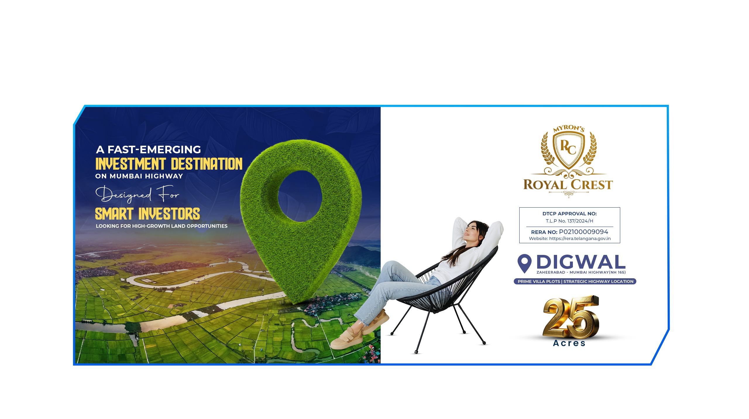 Royal Crest is a DTCP-approved premium villa plot venture located at Digwal near Zaheerabad on the Mumbai Highway (NH-65). Spread across a serene landscape, it offers 286 clear-title residential plots, making it an ideal choice for building your dream home or making a smart investment. The Vaasthu-compliant layout, along with well-planned infrastructure, landscaped open spaces, and modern amenities, ensures a comfortable and secure lifestyle. A well-designed clubhouse and recreational areas provide the perfect space for relaxation and community living.